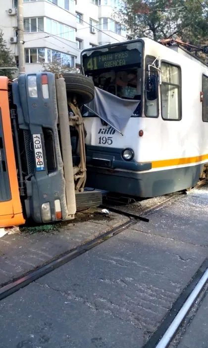 GALERIE FOTO: Accident grav în București: un camion a intrat în tramvaiul 41 și s-a răsturnat