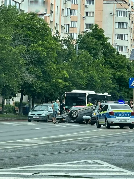 Accident grav în Capitală. O mașină, răsturnată pe plafon. Sunt două victime