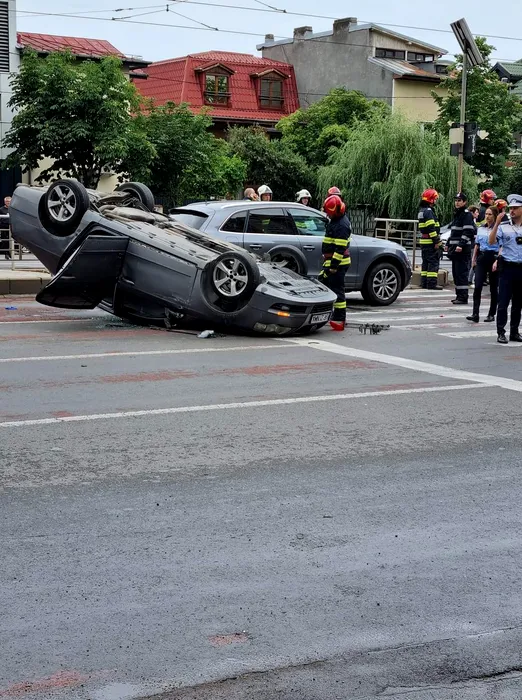 Accident grav în Capitală. O mașină, răsturnată pe plafon. Sunt două victime