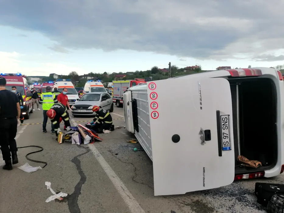 Accident grav în județul Iași: 13 persoane, inclusiv un minor, au ajuns la spital după o coliziune între un microbuz și un autotren – FOTO/VIDEO