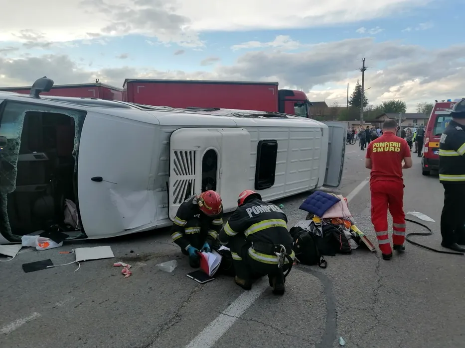 Accident grav în județul Iași: 13 persoane, inclusiv un minor, au ajuns la spital după o coliziune între un microbuz și un autotren – FOTO/VIDEO