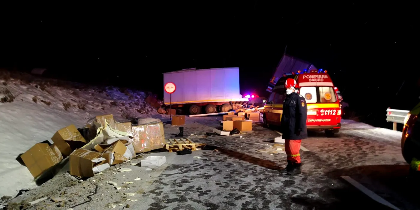Accident grav! Un om a murit după ce două TIR-uri s-au ciocnit pe DN13 Brașov-Sighișoara (FOTO & VIDEO)