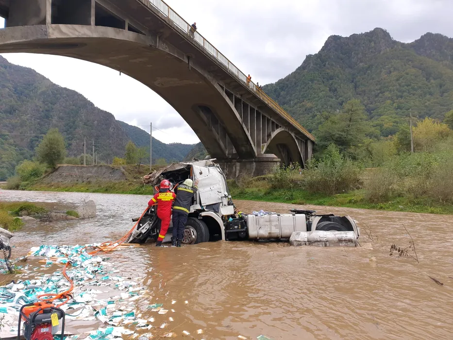 Accident groaznic! Un TIR a căzut de pe un viaduct, în râul Lotru. Șoferul a murit strivit! GALERIE FOTO