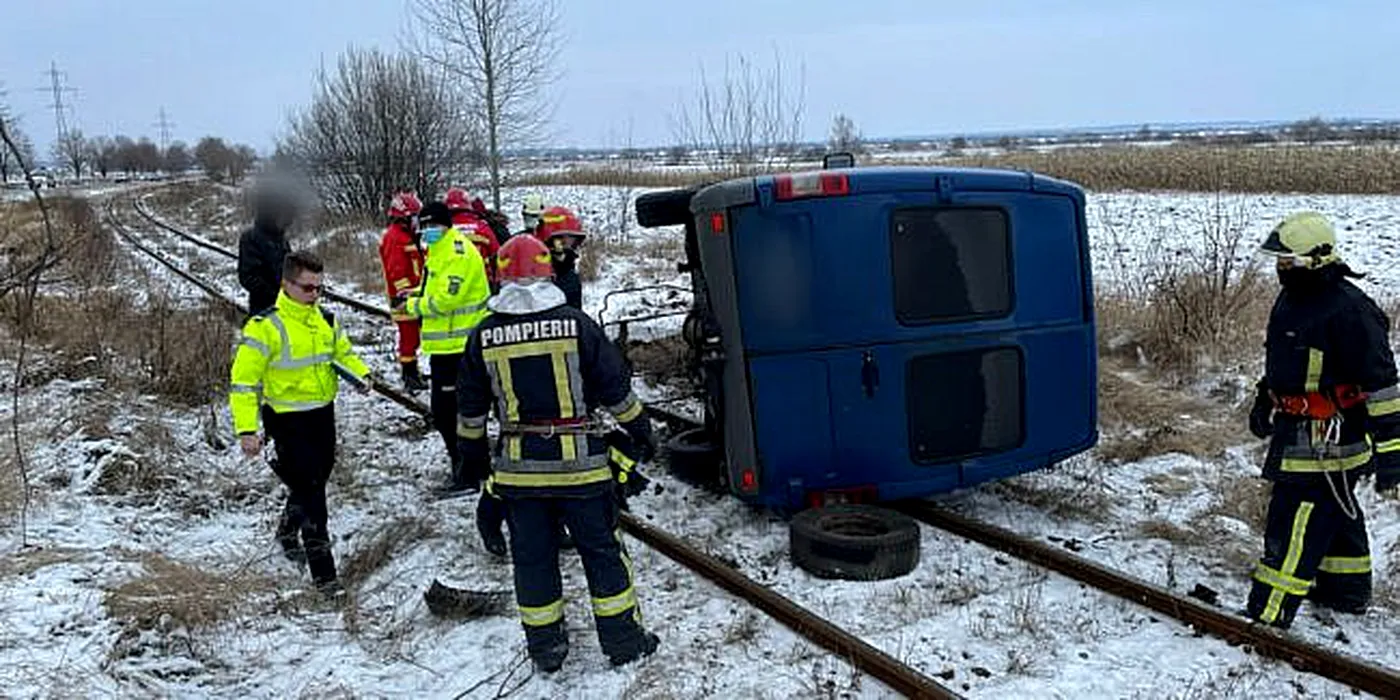 Accident în Suceava, după ce un microbuz s-a răsturnat pe calea ferată. În ce stare se află cele două persoane din vehicul / GALERIE FOTO