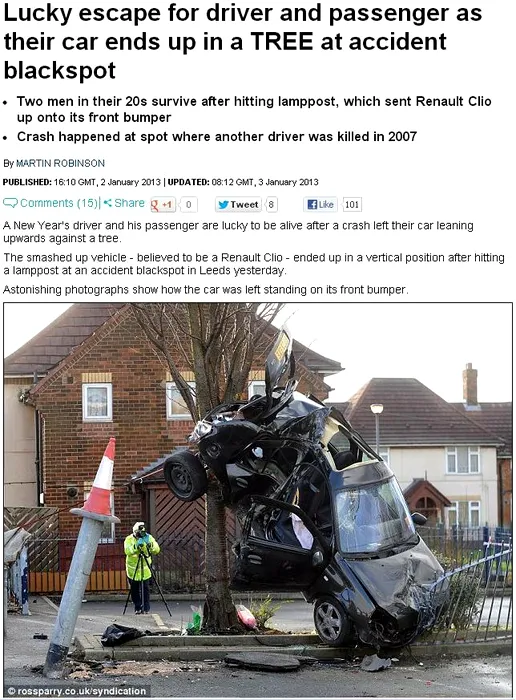 GALERIE FOTO: Accident incredibil de Anul Nou. Mașină cu doi tineri, suspendată de un copac