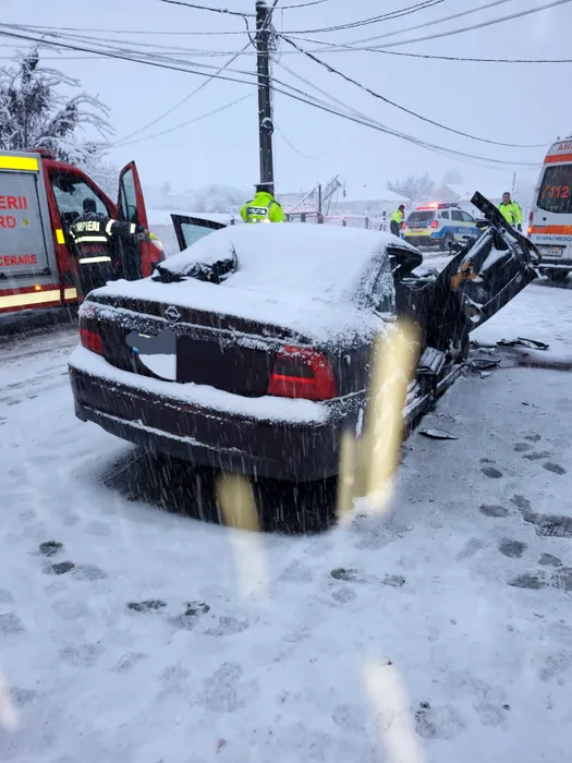 FOTO: Accident mortal la Malu Mare, județul Dolj: O mașină a intrat într-un utilaj de deszăpezire. O persoană a decedat și alte patru au ajuns la spital