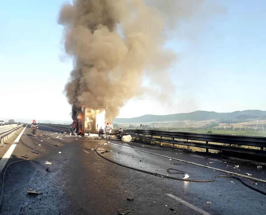 Accident pe A1 Sibiu – Deva. Un autotren s-a răsturnat și a luat foc (Galerie FOTO)