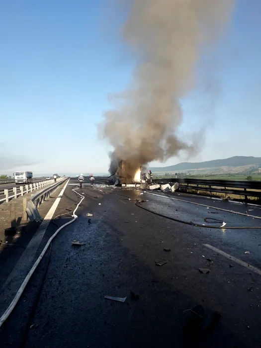 Accident pe A1 Sibiu – Deva. Un autotren s-a răsturnat și a luat foc (Galerie FOTO)