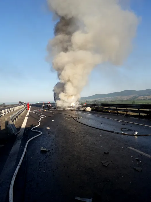 Accident pe A1 Sibiu – Deva. Un autotren s-a răsturnat și a luat foc (Galerie FOTO)