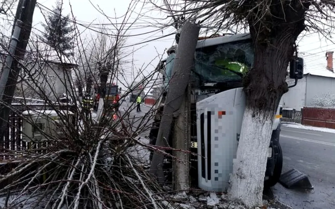 Accident rutier în Câmpulung Muscel. Stâlp de electricitate, rupt în două de o mașină de gunoi