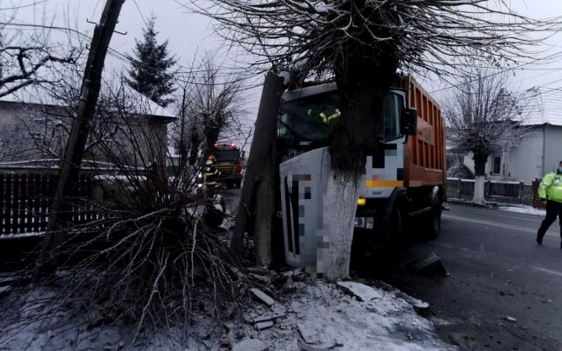 Accident rutier în Câmpulung Muscel. Stâlp de electricitate, rupt în două de o mașină de gunoi