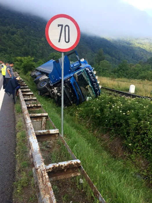 Accident TIR răsturnat pe calea ferată Vâlcea Câineni Valea Mărului