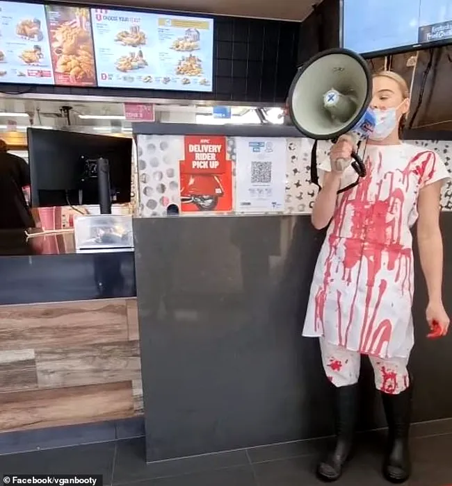 Activista Vegan Booty a aruncat cu vopsea roșie într-un restaurant KFC: „Sunteți măcelarii animalelor!” Ce i-au răspuns clienții care mâncau aripioare de pui și burgeri / Foto: Instagram vgnbooty