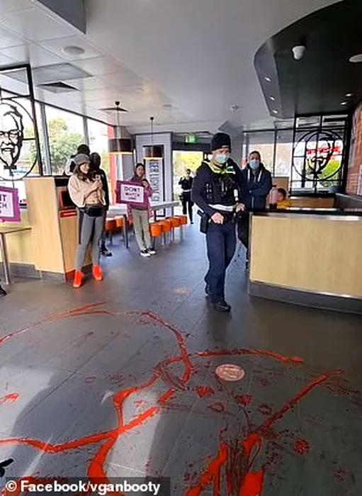 GALERIE FOTO: Activista „Vegan Booty” a aruncat cu vopsea roșie într-un restaurant KFC: „Sunteți măcelarii animalelor!” Ce i-au răspuns clienții care mâncau aripioare de pui și burgeri