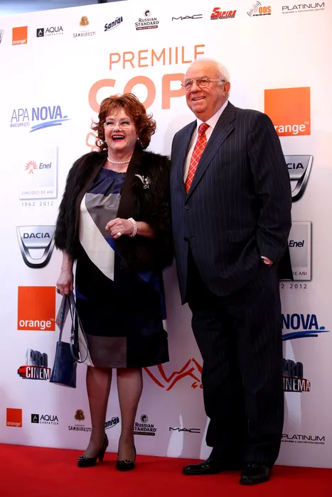 Stela Popescu si Alexandru Arsinel pozeaza la panou inaintea celei de-a VI-a editii a galei premiilor Gopo 2012, organizata de asociatia pentru promovarea filmului romanesc, desfasurate in Bucuresti, luni, 26 martie 2012. MIHAI DASCALESCU / MEDIAFAX FOTO