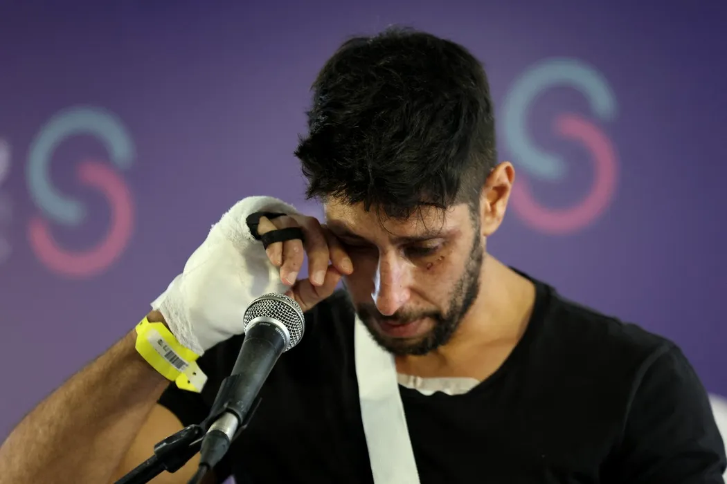 Israeli singer and Netflix hit series Fauda actor Idan Amedi -- who was wounded in the Gaza Strip where he was serving as a reservist earlier this month -- addresses a press conference at Hashomer hospital in Ramat Gan, near Tel Aviv, on January 25, 2024, amid continuing battles between Israel and the Palestinian militant group Hamas in Gaza. On October 12, amid a call-up of more than 300,000 reservists in Israel, Amedi posted a video on social media in military fatigues with the message "it's not a scene from Fauda, it's real life".,Image: 840391440, License: Rights-managed, Restrictions: , Model Release: no