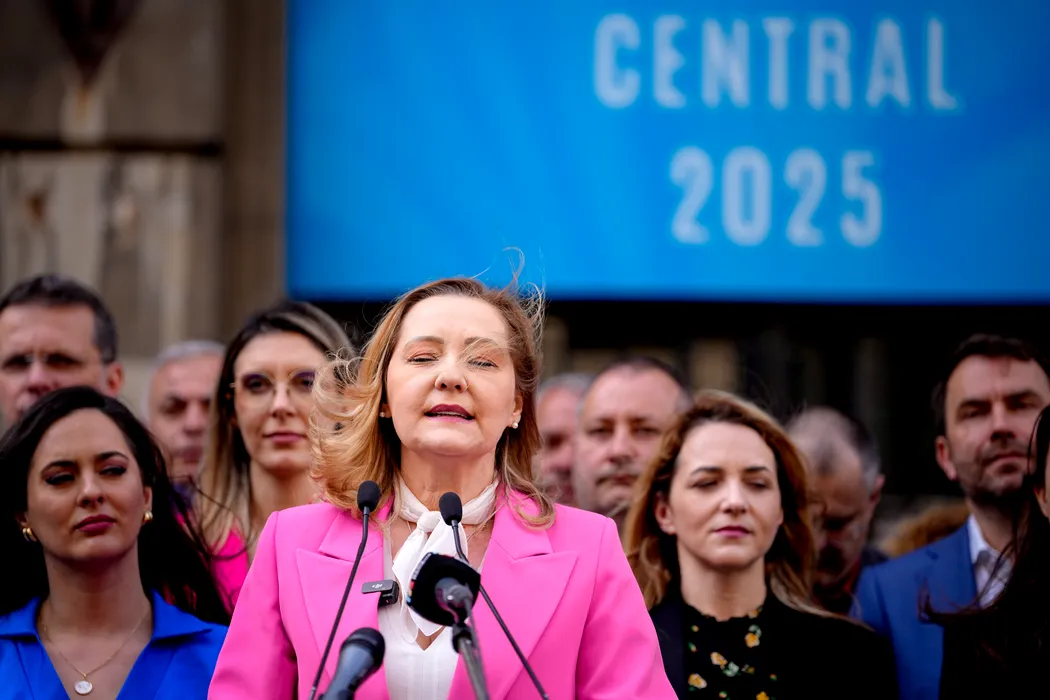 Elena Lasconi, presedinta USR, se adreseaza sustinatorilor sai, dupa depunerea dosarului de candidatura pentru alegerile prezidentiale din luna mai, la Biroul Electoral Central din Bucuresti, joi, 13 martie 2025. ANDREEA ALEXANDRU / MEDIAFAX FOTO