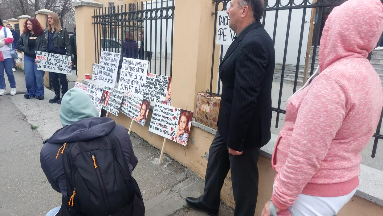 Mai mulţi prieteni şi colegi ai Melisei, tânăra ucisă, au venit la Tribunalul Dolj cu pancarte pe care au afişat mesaje pentru aceasta şi împotriva criminalului / Sursa foto: Gandul