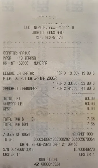 Bonul unei comenzi de la un restaurant din Neptun-Olimp