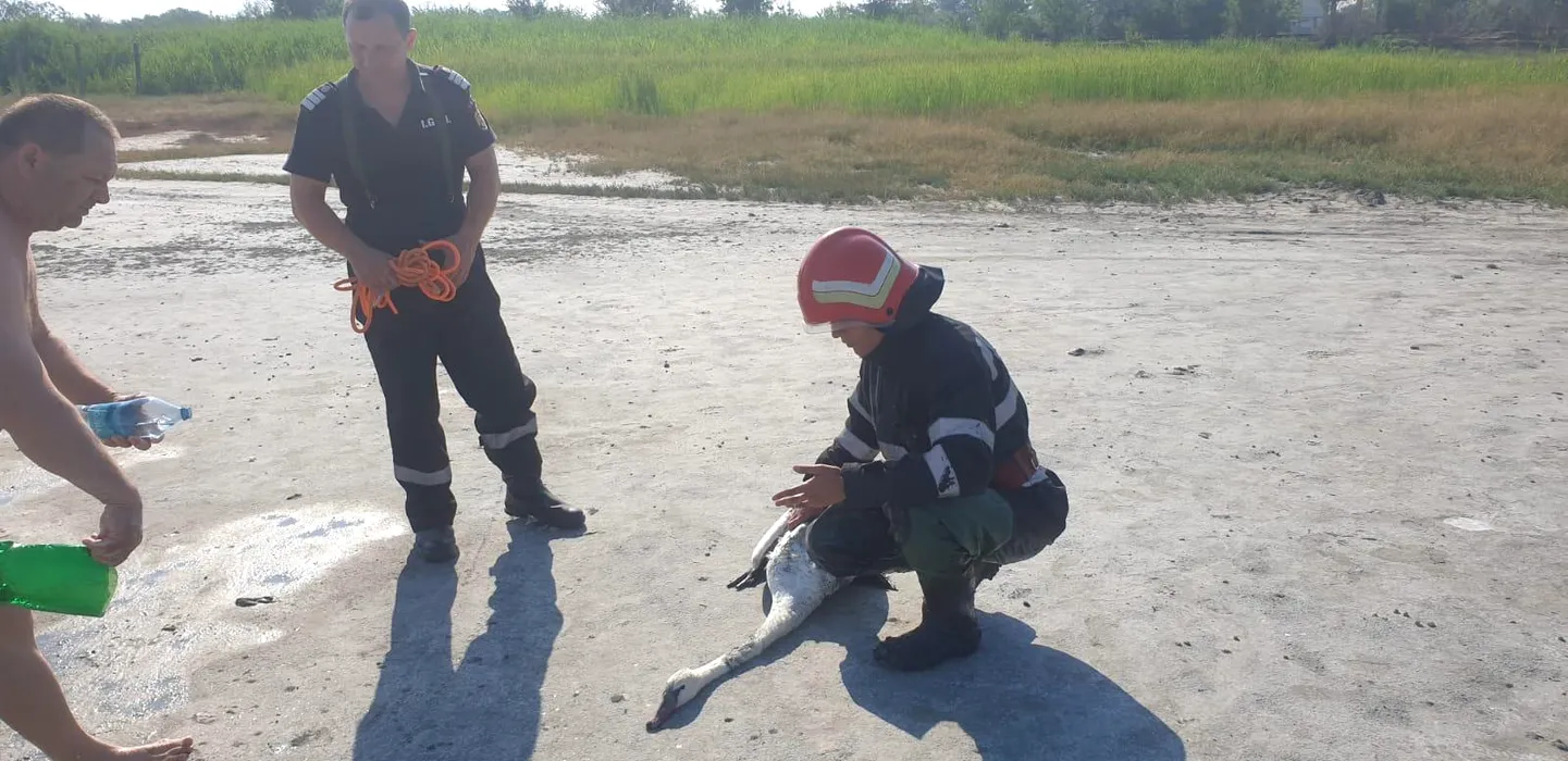 AJUTOR. Lebădă blocată în mâl, salvată de pompieri. Pasărea încerca să iasă, dar nu reușea – GALERIE FOTO