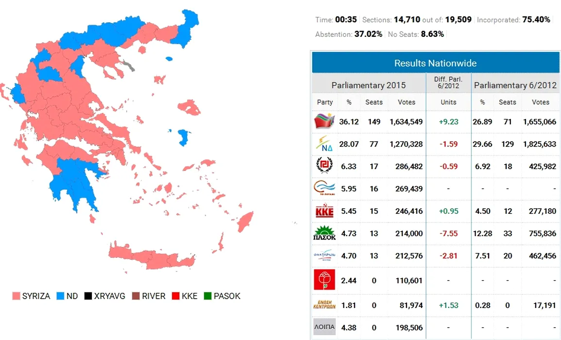 ALEGERI GRECIA. Victorie pentru stânga radicală. Rezultate oficiale parțiale: Syriza – 36%, Noua Democrație – 27%