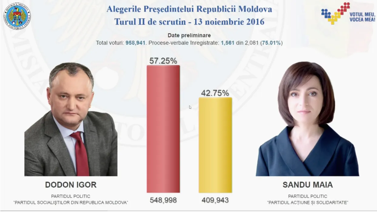 ALEGERI în Republica Moldova. Prorusul Igor Dodon câștigă prezidențialele în fața proeuropenei Maia Sandu