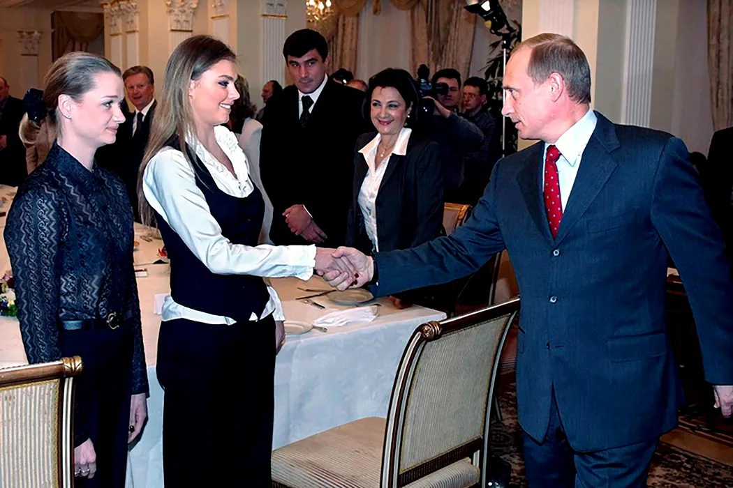 Alina Kabaeva shakes hands with Vladimir Putin during a meeting with other gymnasts in Kremlin,Image: 687921916, License: Rights-managed, Restrictions: ***