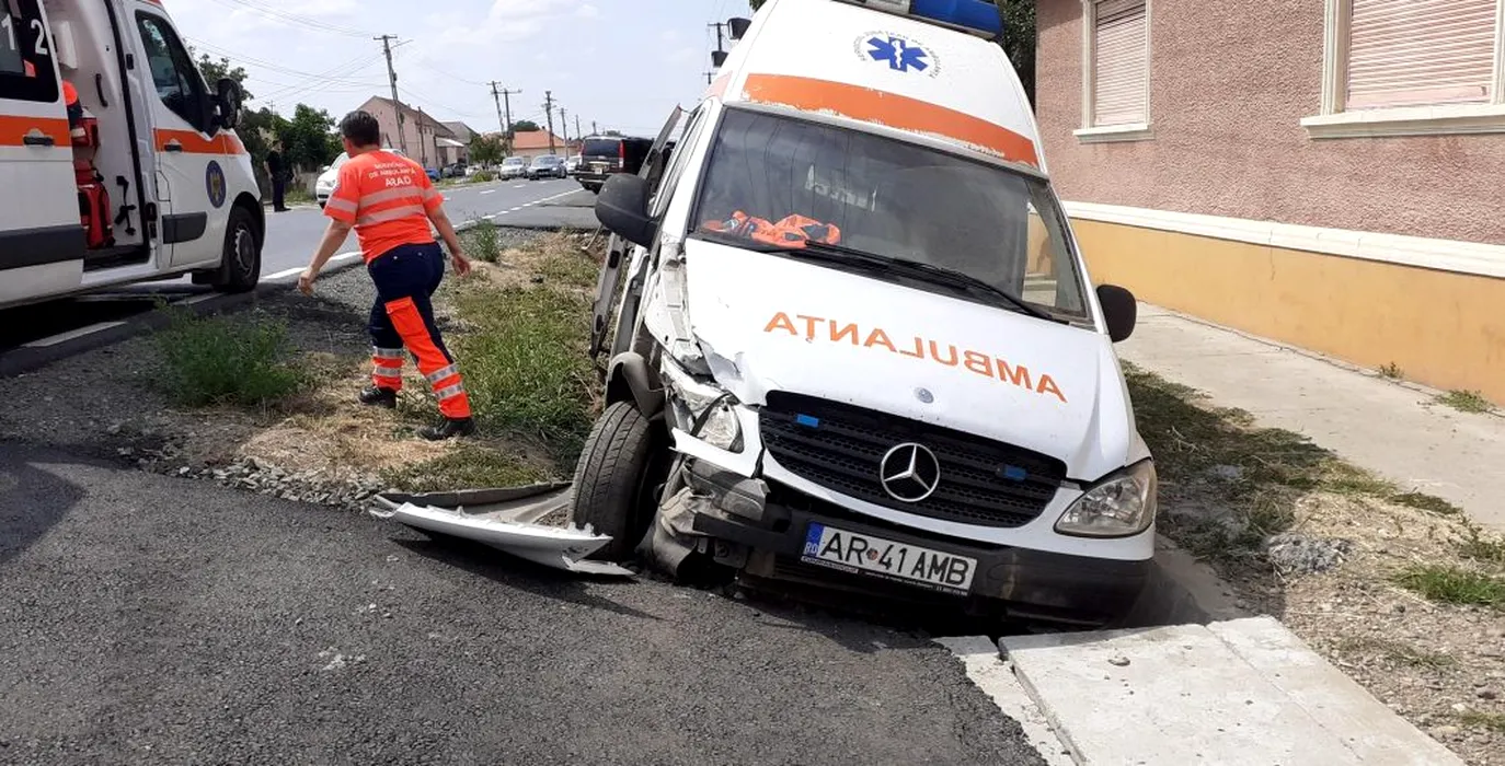 FOTO | Ambulanță implicată într-un accident, pe un drum județean din Arad. Șoferul autospecialei a fost rănit