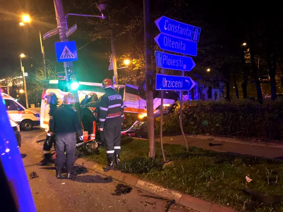Ambulanță cu pacient, răsturnată într-o intersecție din sectorul 3 după impactul cu o mașină care nu i-a acordat prioritate