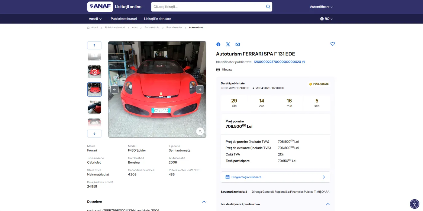 ANAF a scos la licitație un Lamborghini. Prețul de pornire este un chilipir