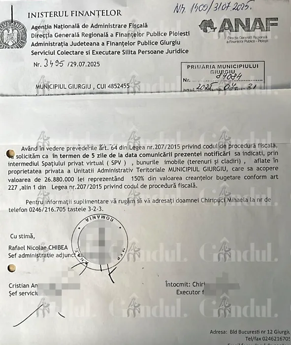 ANAF execută Primăria liberală Giurgiu pentru o DATORIE de aproape 27 de milioane de lei. Agenția a trecut deja la inventarierea bunurilor!
