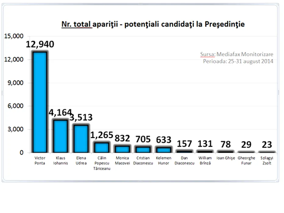 ANALIZĂ Mediafax Monitorizare: Candidații la Președinție, după topul aparițiilor în media – Ponta, Iohannis și Udrea pe primele locuri