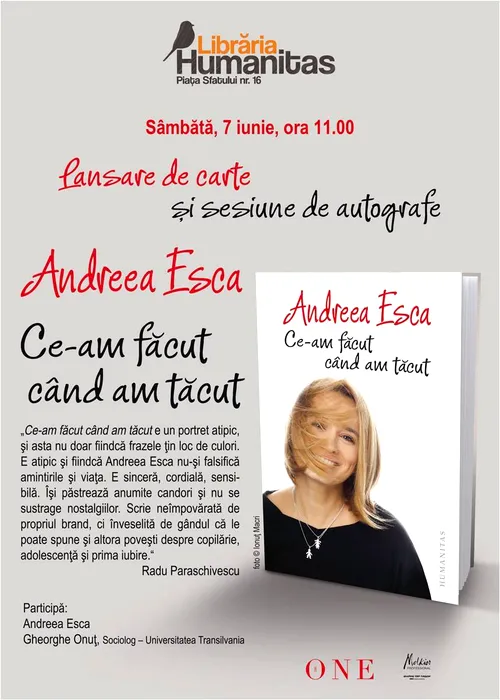 Andreea Esca, în turneu de promovare a cărții „Ce-am făcut când am tăcut”, la Brașov, Sibiu și Cluj