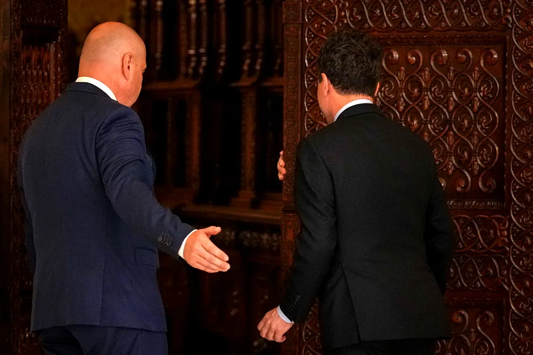 Presedintele Romaniei, Nicusor Dan (D), si Ilie Bolojan (S), premierul desemnat, parasesc Sala Unirii a Palatului Cotroceni, dupa ce au sustinut declaratii de presa, vineri, 20 iunie 2025. ANDREEA ALEXANDRU / MEDIAFAX FOTO