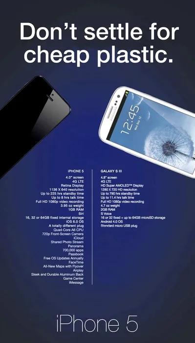 APPLE IPHONE 5 VS SAMSUNG GALAXY S3. Fanii IPHONE și APPLE ironizează reclamele SAMSUNG: „Telefonul vostru e o bucată de plastic urâtă și ieftină”. FOTO