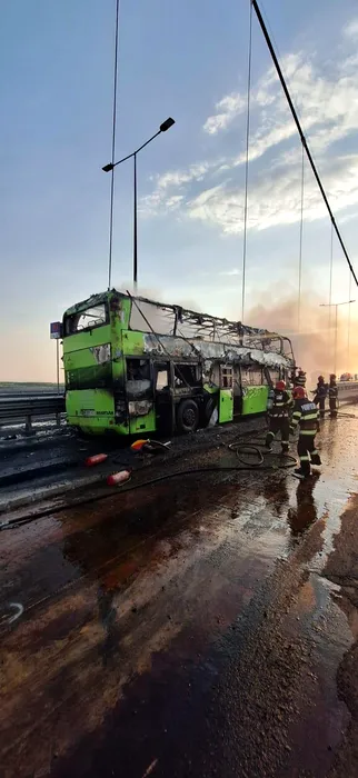 A ars ca o torță! Un autocar cu cetățeni ucraineni a luat FOC pe podul de la Brăila