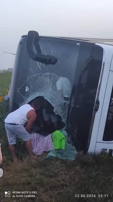 Autocar înmatriculat în BULGARIA, răsturnat pe DN2, în Vrancea/Opt persoane au suferit răni ușoare, una a fost dusă la spital