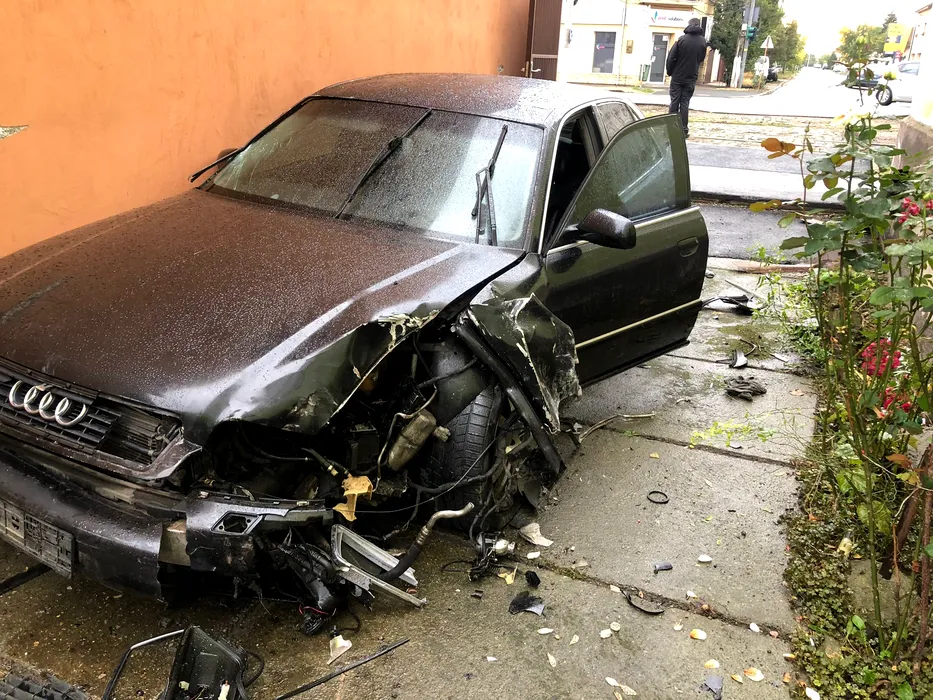 Autoturism avariat și fără plăcuțe de înmatriculare, abandonat în curtea unei femei din Arad. Polițiștii îl caută pe șofer (FOTO)