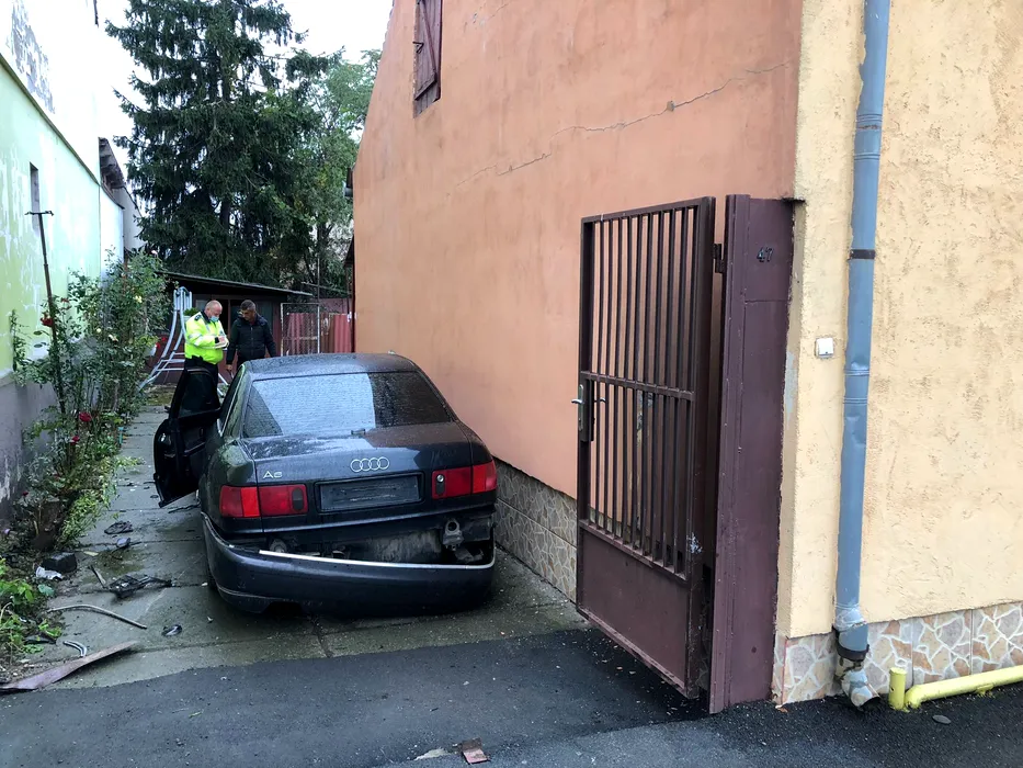 Autoturism avariat și fără plăcuțe de înmatriculare, abandonat în curtea unei femei din Arad. Polițiștii îl caută pe șofer (FOTO)