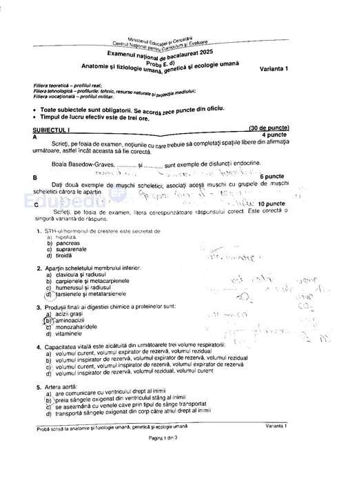 Subiectele la Biologie – Anatomie umană, genetică și ecologie, pag 1/3