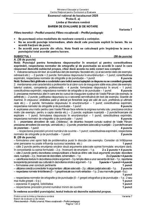 Barem de corectare pentru proba scrisă la Limba și Literatura Română - profil Uman, pag. 1/2