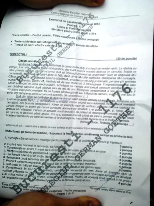 BACALAUREAT 2014. Ce subiecte au primit elevii la proba scrisă de limba română la profilul UMAN BAC 2014. UPDATE