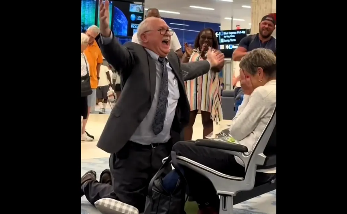 După 60 de ani, un bărbat şi-a cerut în căsătorie iubita din liceu, pe aeroport / Sursa foto: captură video TikTok