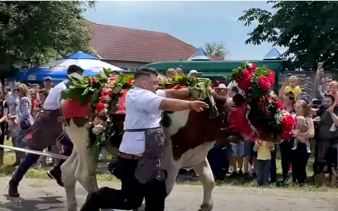 Bărbat pus la pământ de un bou nărăvaș la o sărbătoare tradițională în Cluj