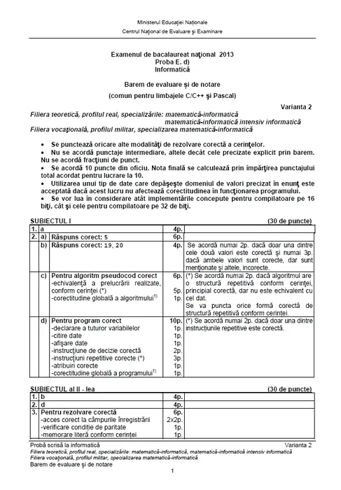 BAREM BAC 2013 INFORMATICĂ. Baremele de corectare pentru subiectele la proba de informatică la bacalaureat 2013