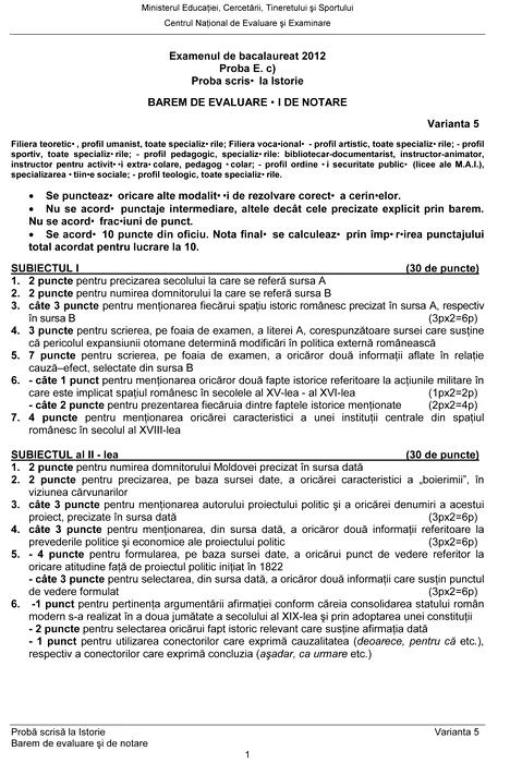 BAREM ISTORIE BAC 2012. Subiect ISTORIE la BACALAUREAT 2012