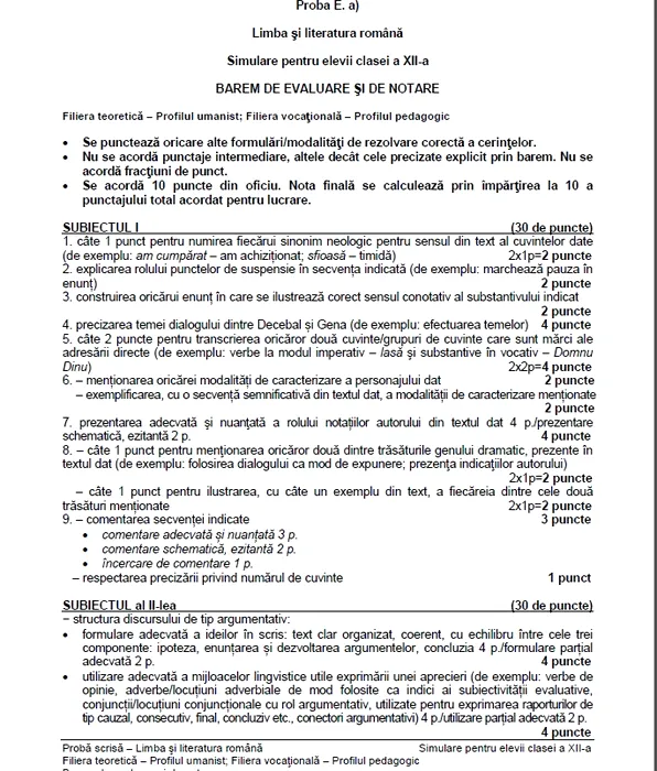 BAREM ROMÂNĂ BAC 2014. Baremul la simulare BACALAUREAT 2014 – clasa a XII-a