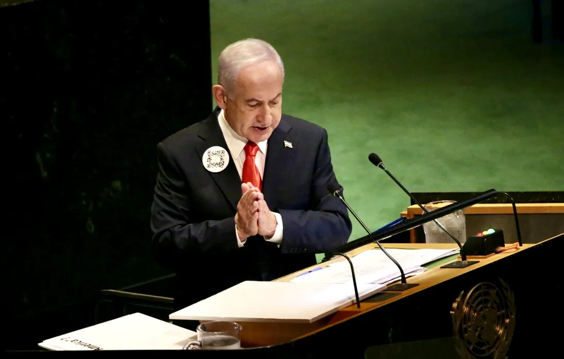 Benjamin Netanyahu a purtat o insignă specială în timpul discursului de la Adunarea Generală a ONU. Ce era inscripționat pe aceasta