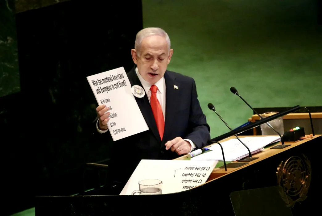 Benjamin Netanyahu a purtat o insignă specială în timpul discursului de la Adunarea Generală a ONU. Ce era inscripționat pe aceasta