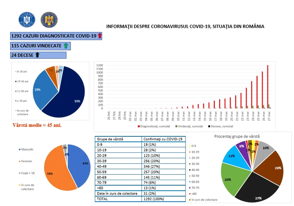 GALERIE FOTO: BILANȚ CORONAVIRUS | Numărul infectărilor a ajuns la 1.292 în România. 263 noi cazuri în ultimele 24 de ore / Bilanțul morților a ajuns la 24